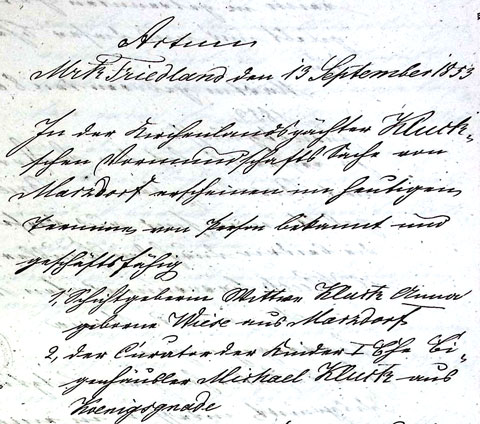 Martin Kluck hatte zwar vor dem Dorfgericht ein Testament hinterlassen, aber das wurde vom Gericht nicht als rechtsgültig akzeptiert.45Actum Märk. Friedland, 13. September 1853. In: Grundakte Marzdorf Bd. Ⅰ, Bl. Nr. 10, Blatt 38 RS. Es kam daher die gesetzliche Erbfolge zur Anwendung, und der Witwe stand lediglich ein Viertel des Nachlasses zu, weil sie zum Zeitpunkt der Eheschließung nach dem Gesetz minderjährig war und daher mit ihrem Ehemann »in getrennten Gütern« lebte.46A. a. O., Blatt 38 VS. Diese Ausgangssituation scheint Anna Christina Kluck überfordert zu haben, denn es heißt im Gerichtsprotokoll: