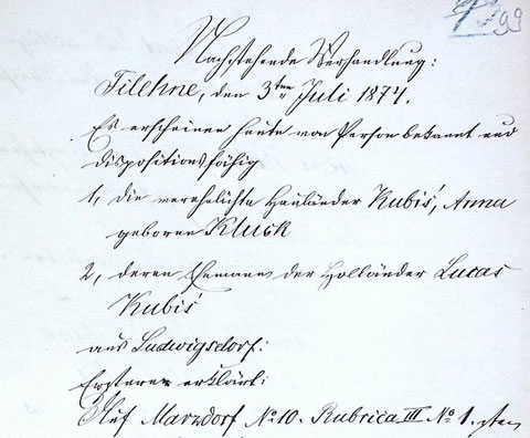 Obwohl Anna Christine Kluck zugesagt hatte, die Erbteile des nun 16-jährigen Joseph Victor Stelter und der 14-jährigen Anna Kluck zu Neujahr 1854 auszuzahlen, scheinen die Zahlungen nicht pünktlich erfolgt zu sein. Der Halbbauer Franz Stelter in Marthe quittierte als Vormund von Joseph Victor jedenfalls erst am 6. März 1856 über den richtigen Empfang des seinem Kuranden ausgesetzten Erbteils und Legats von insgesamt 91 Taler 16 Großen acht Pfennig.60Verhandelt Tütz, 6. März 1856. In: A. a. O., Blatt 56 VS. Die Tochter Anna bestätigte den vollständigen Erhalt ihres Erbteils gar erst am 3. Juli 1874 aus Ludwigsdorf bei Filehne, wo sie mit dem Bauern Lucas Kubis in zweiter Ehe lebte.61Verhandelt Filehne, 3. Juli 1874. In: A. a. O., Blatt 99 VS.