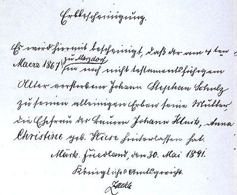 - Johann Stephan Schulz, geboren am 10. April 1863,68Erbrezess vom 13. Dezember 1865. In: A. a. O., Blatt 64 VS. gestorben am 4. März 1867.69Erbbescheinigung vom 30. Mai 1891. In: A. a. O., Blatt 110 VS.