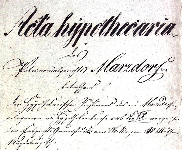 »Acta hypothecaria des Patrimonialgerichts Marzdorf betreffend den hypothekarischen Zustand des in Marzdorf belegenen[,] im Hypothekenbuche sub No. Ⅹ verzeichneten Erbpacht-Grundstücks von 116 Morgen 138 □Ruthen magdeburgisch – Besitzer: Martin Kluck, Wittwe Kluck verehel. Martin Schulz, Johann Klucksche Eheleute, Paul Kluck.«6A. a. O., Umschlag.