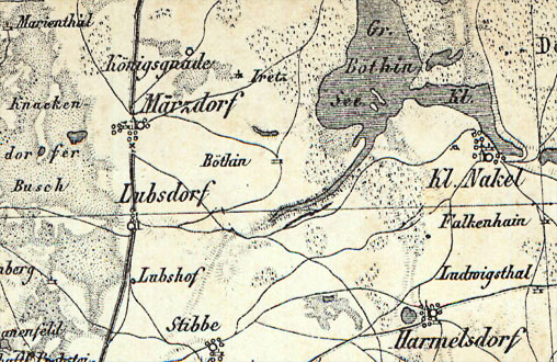 Aus der Überlieferung ist bekannt, dass das vererbpachtete Kirchenland weit abseits vom Dorf zwischen Wucknick- und Böthinsee auf dem sogenannten Iretz lag. Weder im Vertrag noch im Hypothekenbuch findet sich jedoch eine Beschreibung der Lage oder der Beschaffenheit des verpachteten Grundstücks, die über eine reine Größenangabe hinausgeht. Es werden auch keine Bauten erwähnt, obwohl anzunehmen ist, dass Kluck mit seiner Familie an Ort und Stelle lebte. In späteren Jahren bezeichnete das Gericht in Märkisch Friedland das Grundstück als Abbau oder Ausbau von Marzdorf«.14Die Bezeichnung »Ausbau Marzdorf« wird auf einer Posturkunde vom 10. April 1856 (Blatt 53 VS der Grundakte) verwendet; die Bezeichnung »Abbau Marzdorf« nutzte das Gericht erstmalig auf einer Löschungsquittung vom 6. März 1856 (Blatt 56 VS der Grundakte) und von da an nahezu kontinuierlich. Die Bezeichnung »Iretz« findet sich in der Grundakte nur einmal – in einem Brief der Witwe Anna Christina Kluck aus dem Jahr 1899.15Brief vom 22. März 1899. In: A. a. O., Blatt 121 VS.