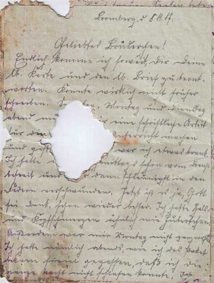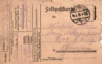 Der erste der aufgefundenen Feldpostbriefe ist auf Donnerstag, den 8. November 1917 datiert und trägt die Absenderadresse: »Kan. Bernh. Neumann, Bromberg, Danzigerstraße 75 d b. Frau Haack«. In der Danziger Straße 89 befand sich damals die Artilleriekaserne, in der Bernhard Neumann zwar Dienst tat, aber offenbar nicht einquartiert war.